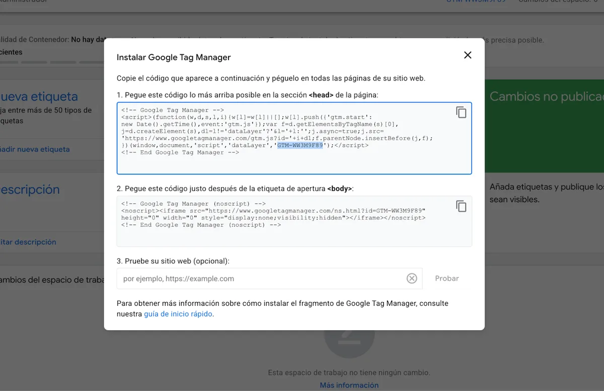 En el campo solicitado, ingresá tu ID de GTM, por ejemplo: