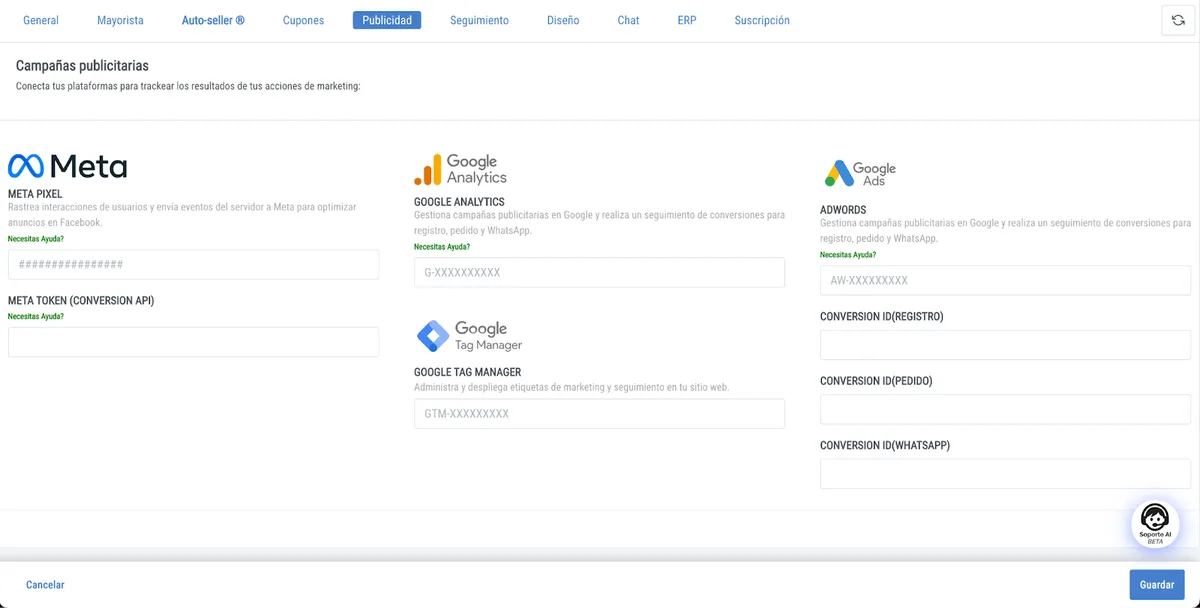 Ingresar el Pixel ID en META Pixel y el token en META Token y guardar para finalizar.
